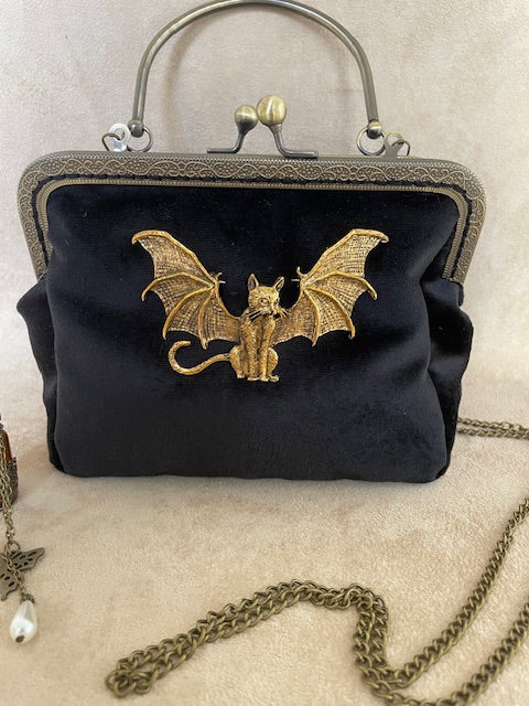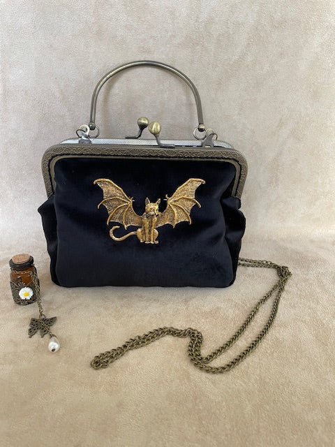 Sublimez vos tenues avec ce clutch au caractère mystérieux, confectionné entièrement en velours noir. En son centre, un chat ailé trône fièrement, figure chimérique mêlant douceur féline et envol énigmatique. Ce détail central transforme le sac en talisman textile, pensé pour celles et ceux qui aiment cultiver leur univers intérieur avec style et singularité.
