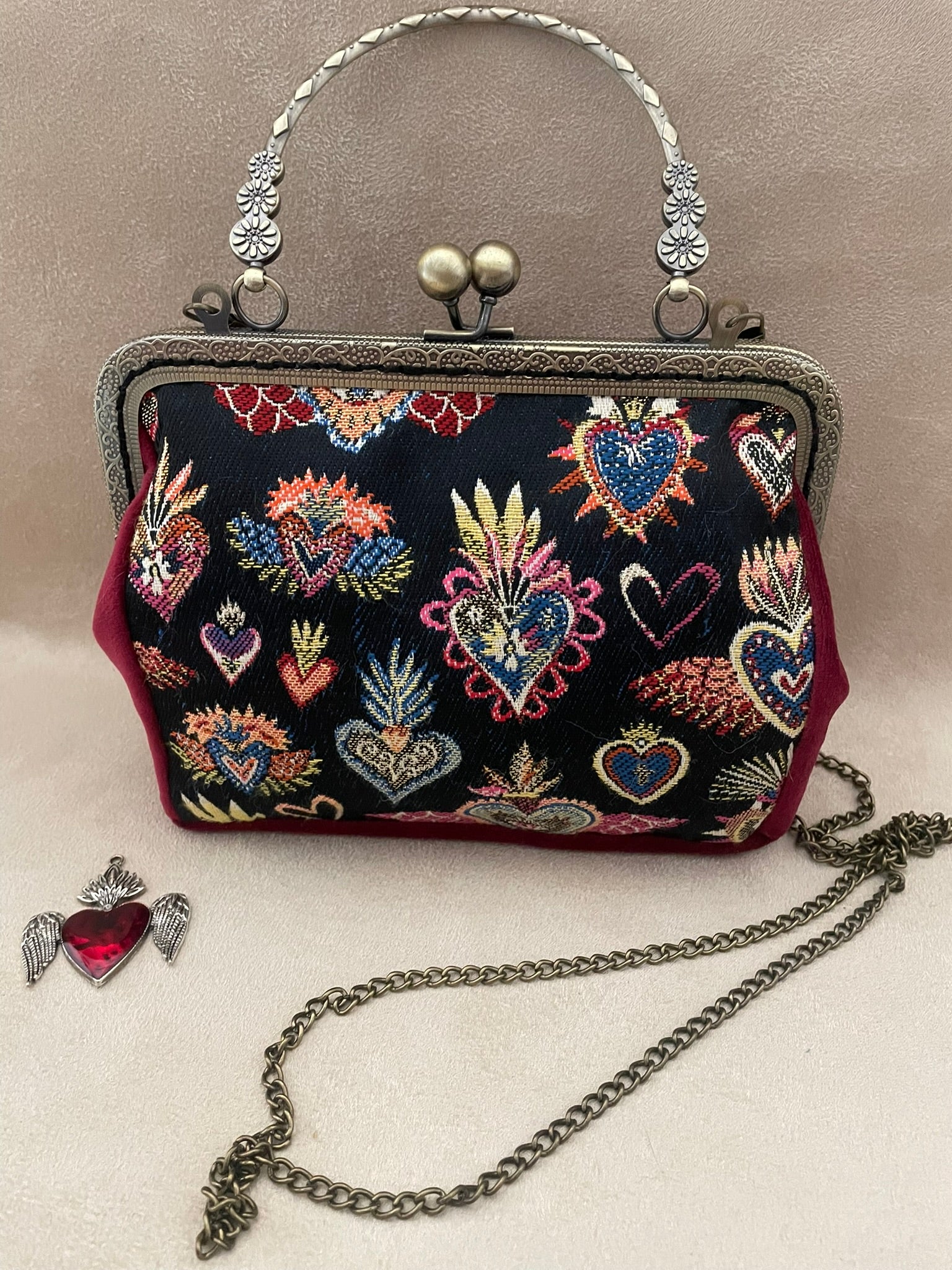 . Matériaux : Velours rouge bordeaux pour les côtés et le dos, sur l'avant un textile imprimé ex-voto avec un lurex doré