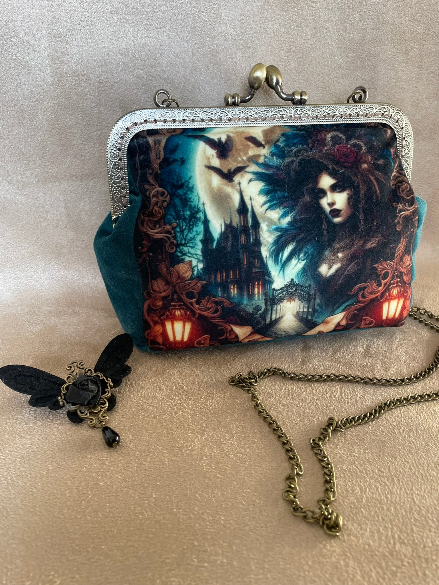 Ce clutch est l'accessoire idéal pour celles qui souhaitent exprimer leur goût pour l'insolite. Le mariage entre le velours et l'illustration manoir crée une pièce à la fois élégante et intrigante. Parfait pour apporter une touche d'élégance et de mystère à vos tenues.