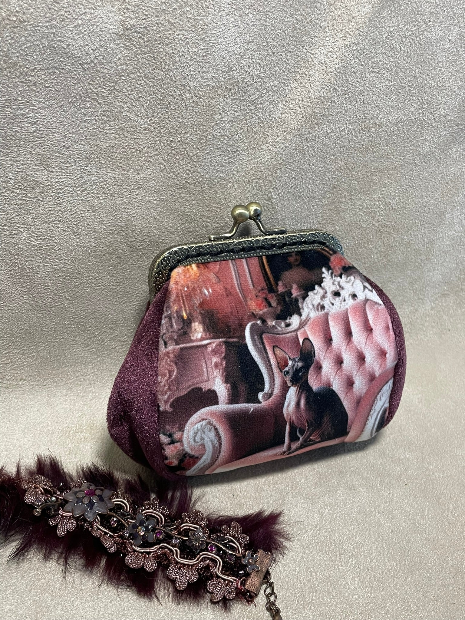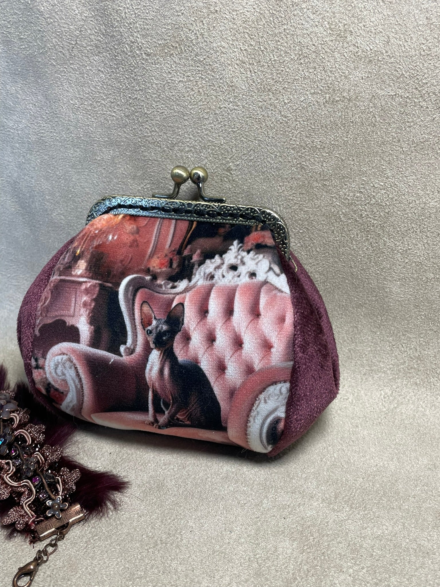 Porte-monnaie “Salon Félin – Chat Sphynx” – Accessoire vintage fait main - Chat élégant & ambiance boudoir