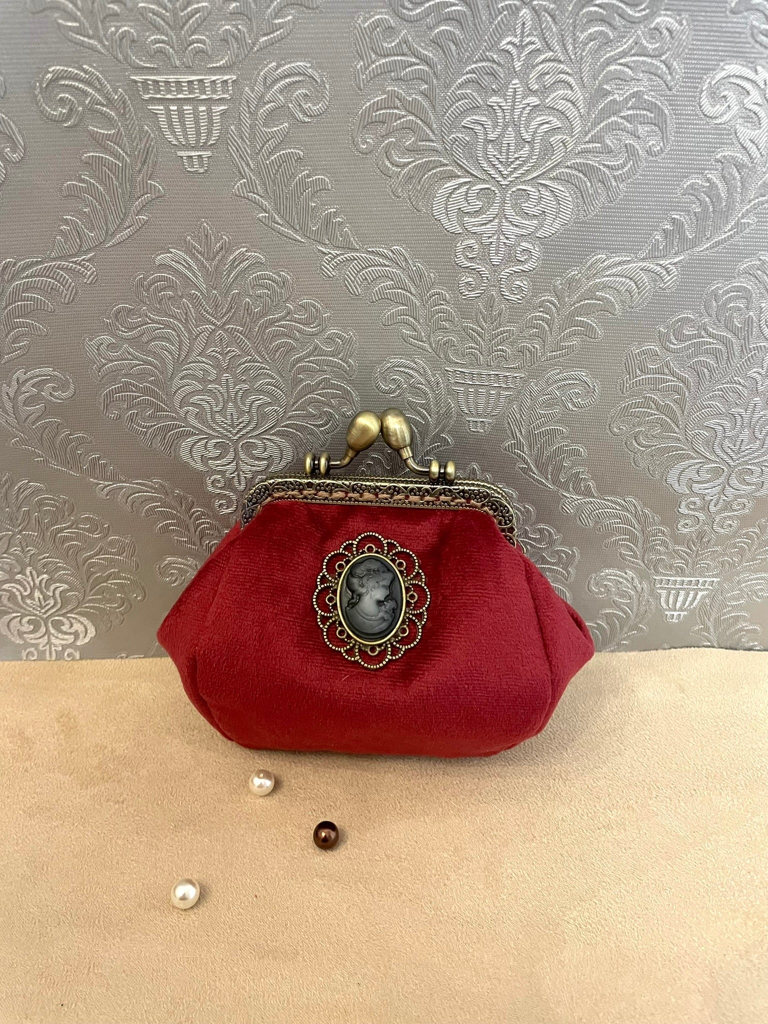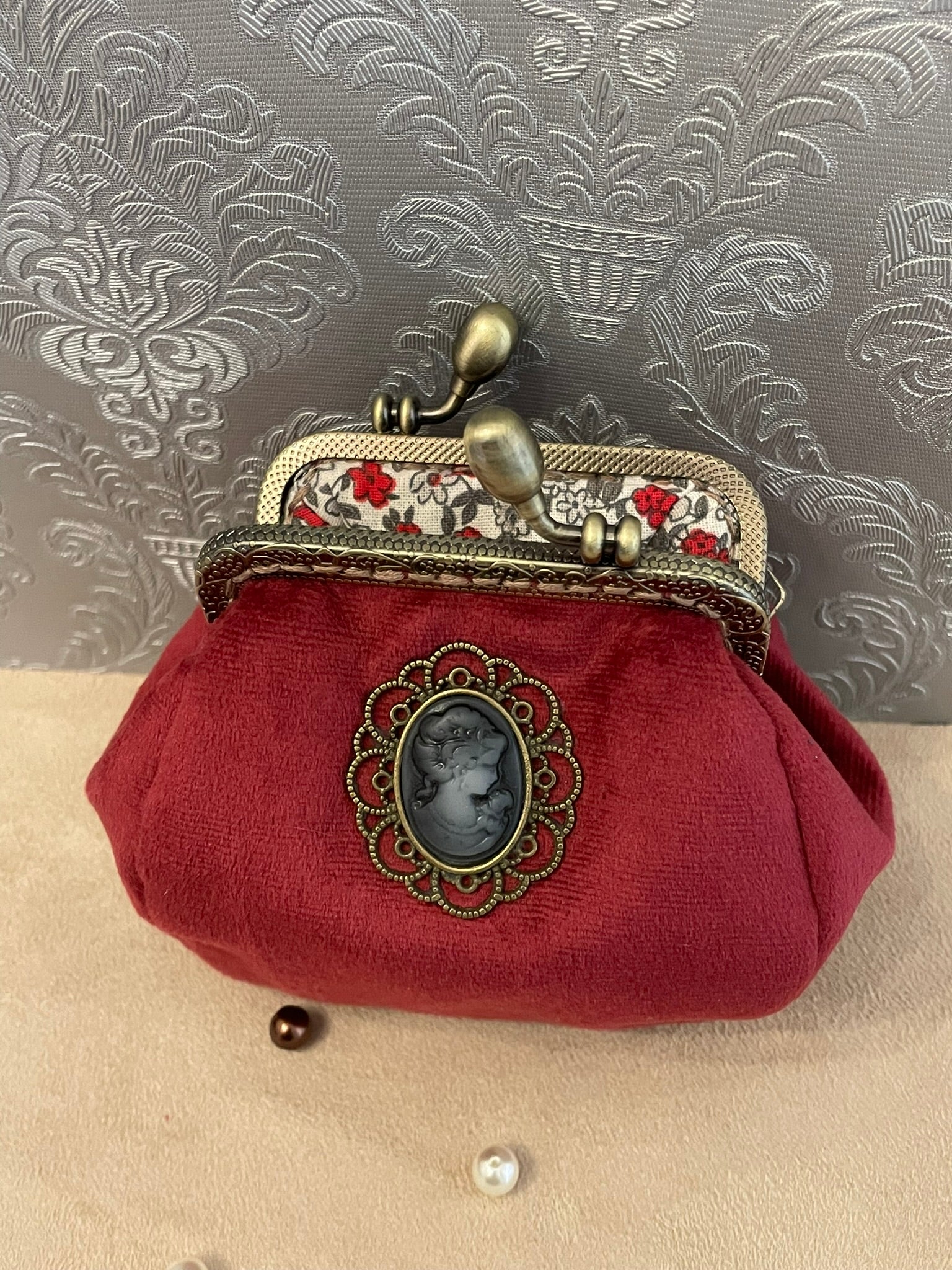 Porte-monnaie rétro en velours bordeaux avec camée victorienne – Fait main & chic intemporel
