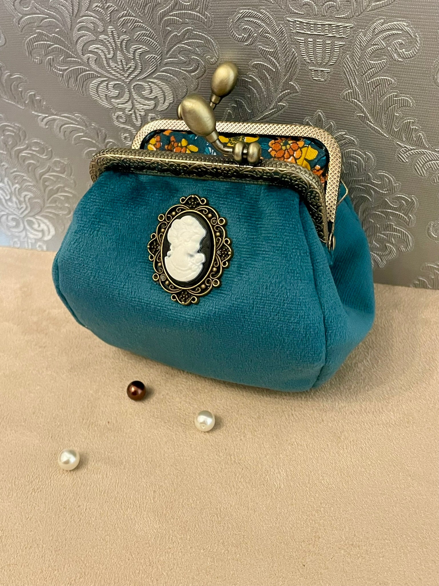 Porte-monnaie rétro en velours bleu avec camée victorienne – Fait main & chic intemporel
