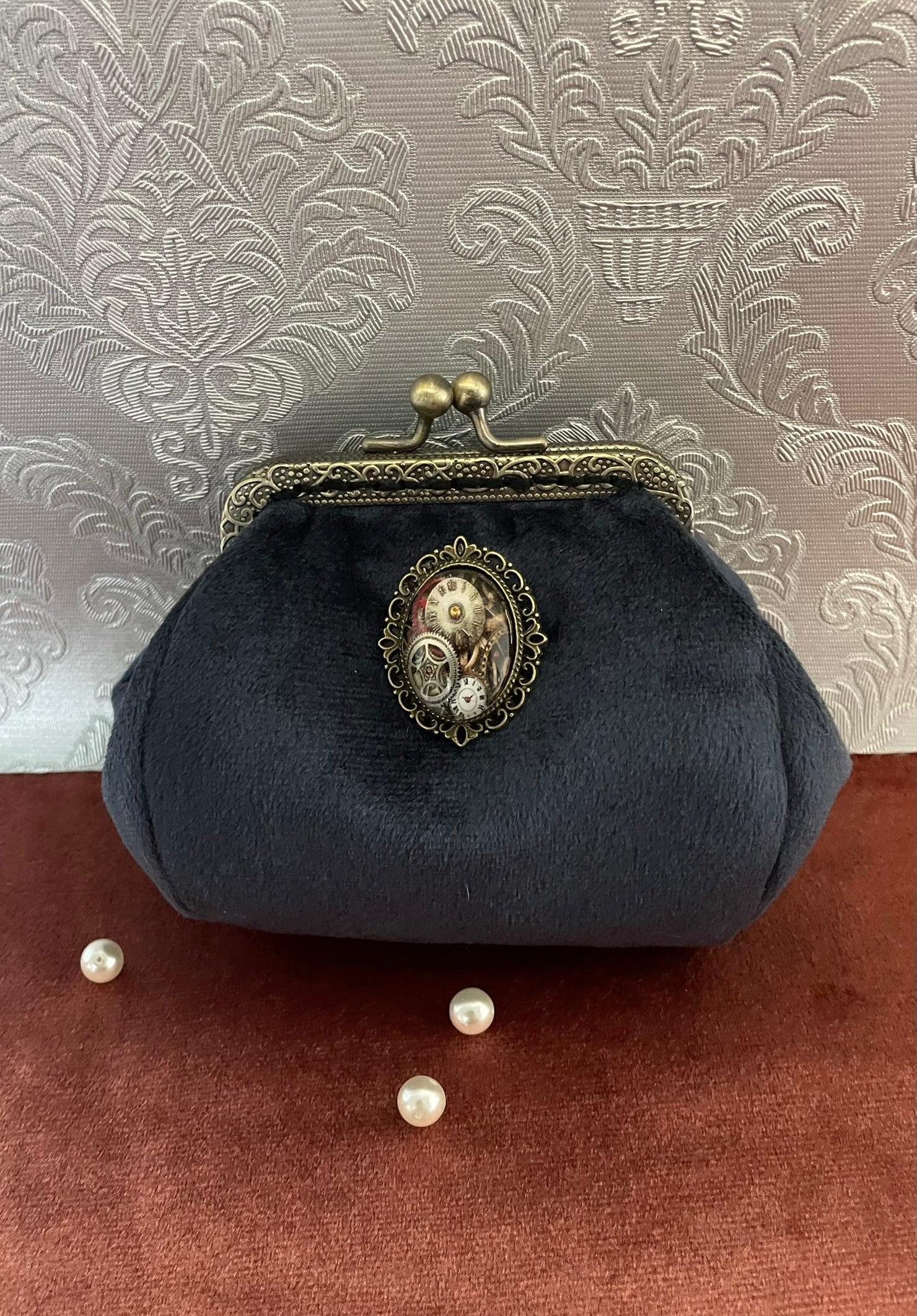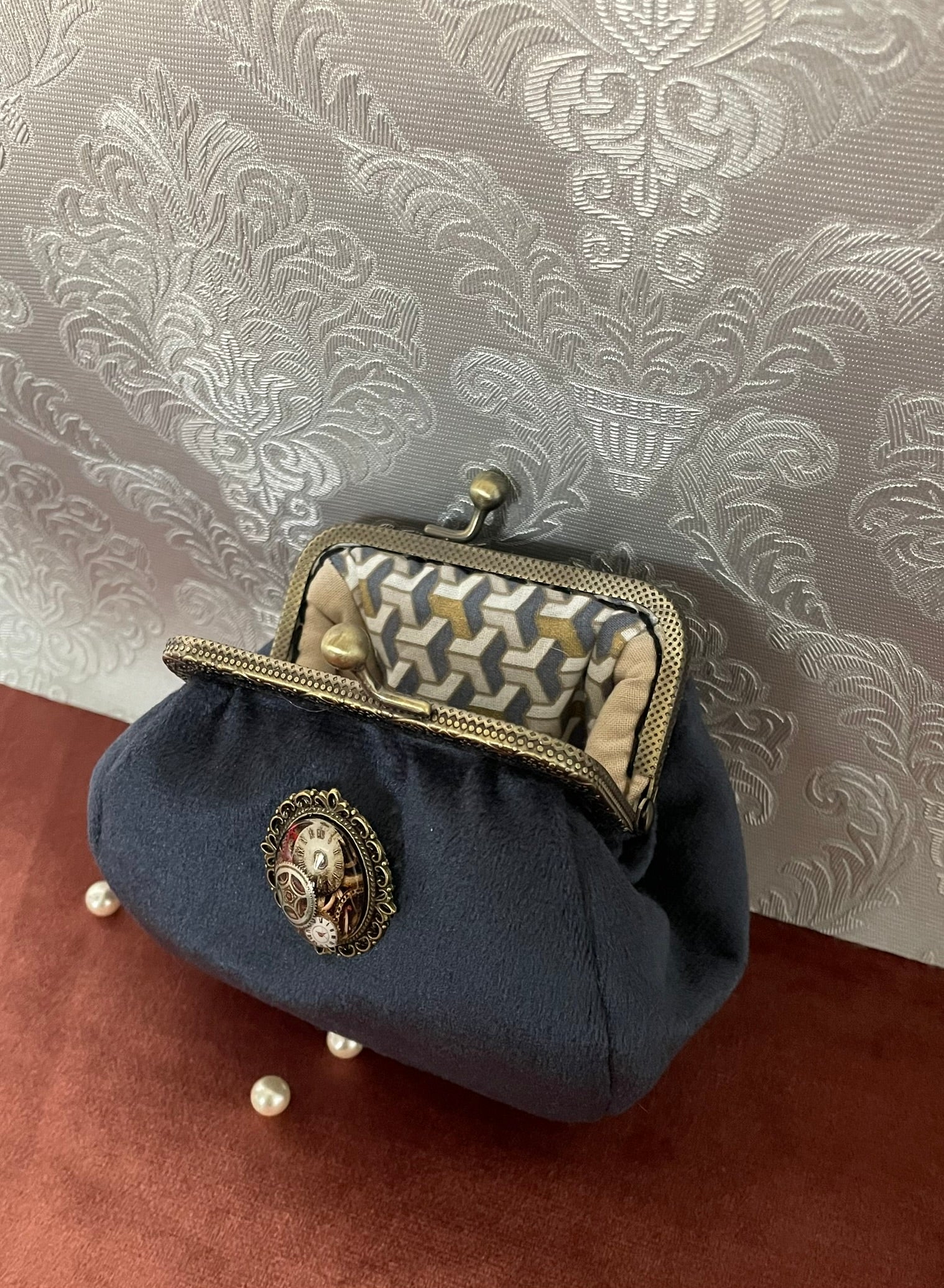 Porte-monnaie Steampunk « L’Engrenage du Temps » – Velours Bleu & Horlogerie Vintage