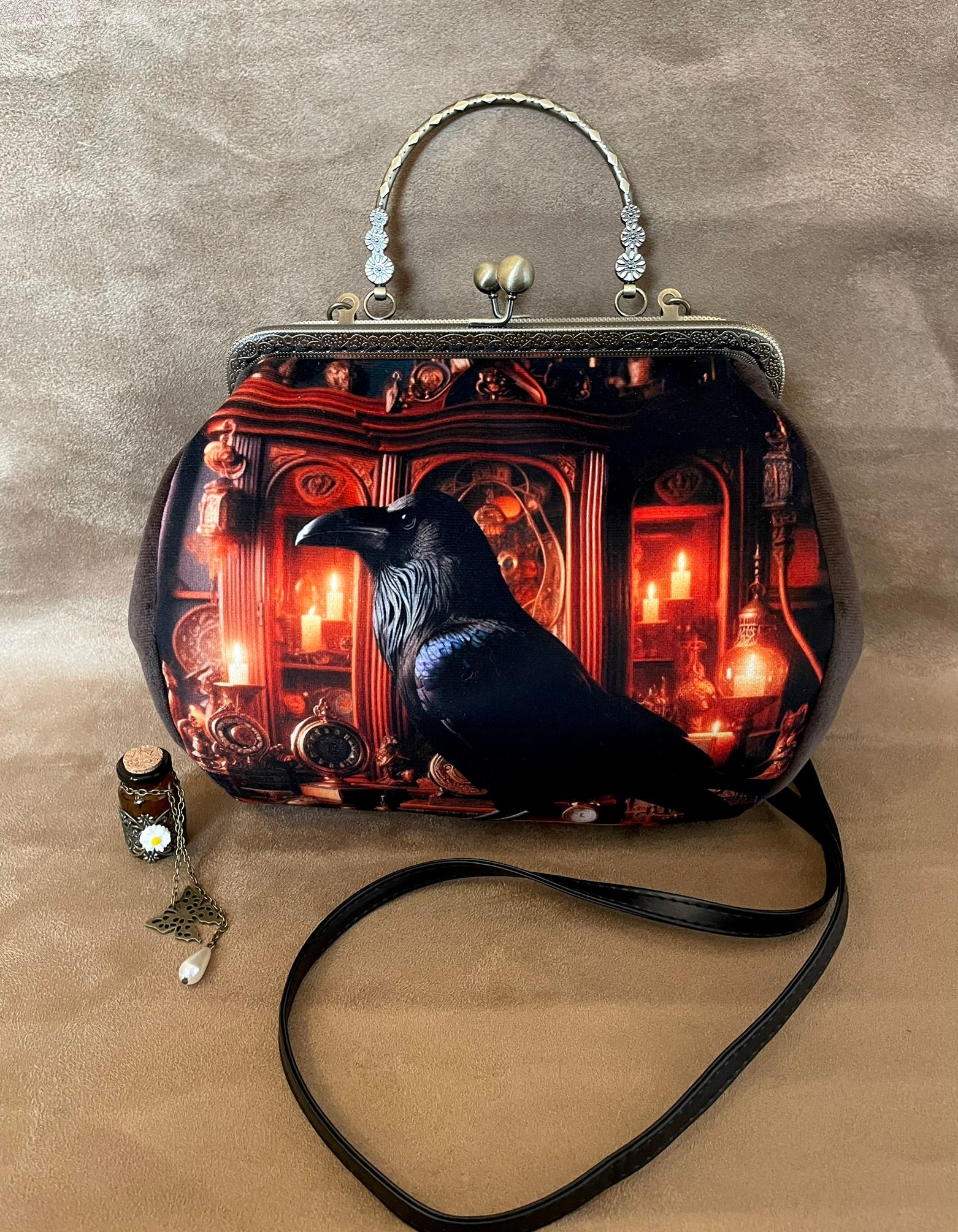 Un sac à main au charme poétique, parfait pour les amatrices d'esthétique sombre, d'art fantastique et de mode alternative raffinée.