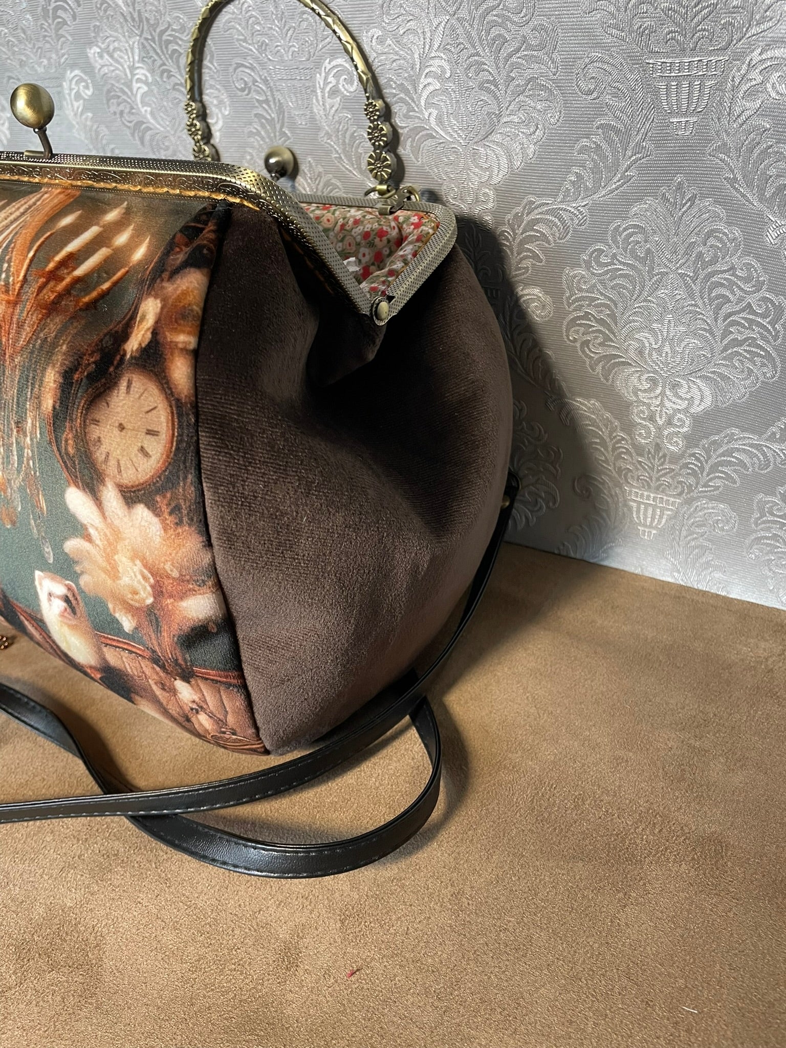 Plongez dans un monde hors du temps avec le sac « Les Gardiens du Temps », une création artisanale singulière où l’imaginaire Steampunk rencontre l’élégance vintage. Véritable pièce de caractère, ce sac met en scène trois mystérieux furets parés de lunettes d’aviateur, veillant sur un décor baroque fait d’horloges anciennes et de lustres en cristal.