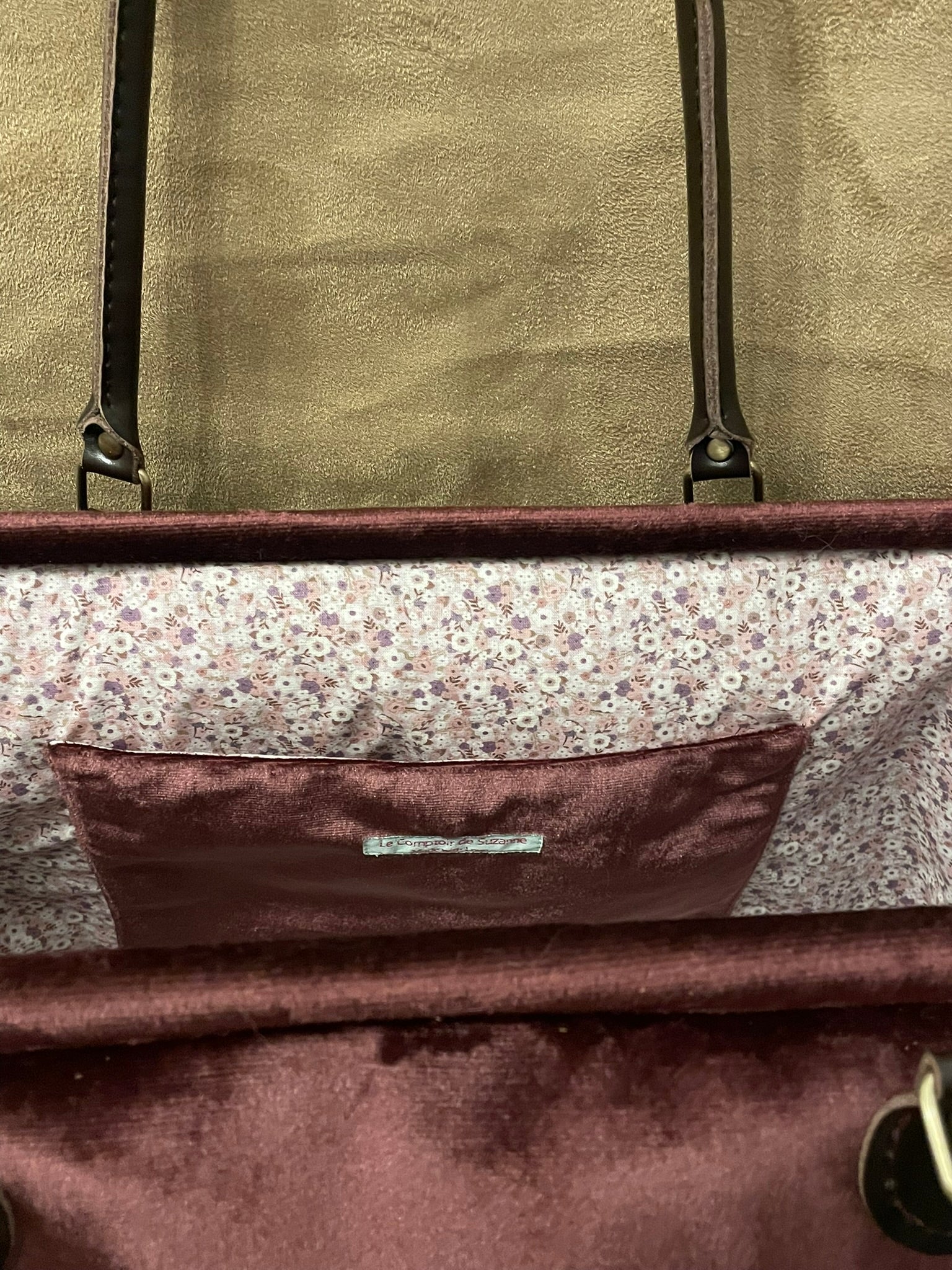 Matières : Velours lie-de-vin, cuir de vachette, métal,