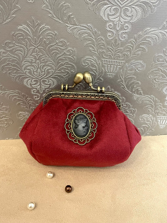 Porte-monnaie rétro en velours bordeaux avec camée victorienne – Fait main & chic intemporel